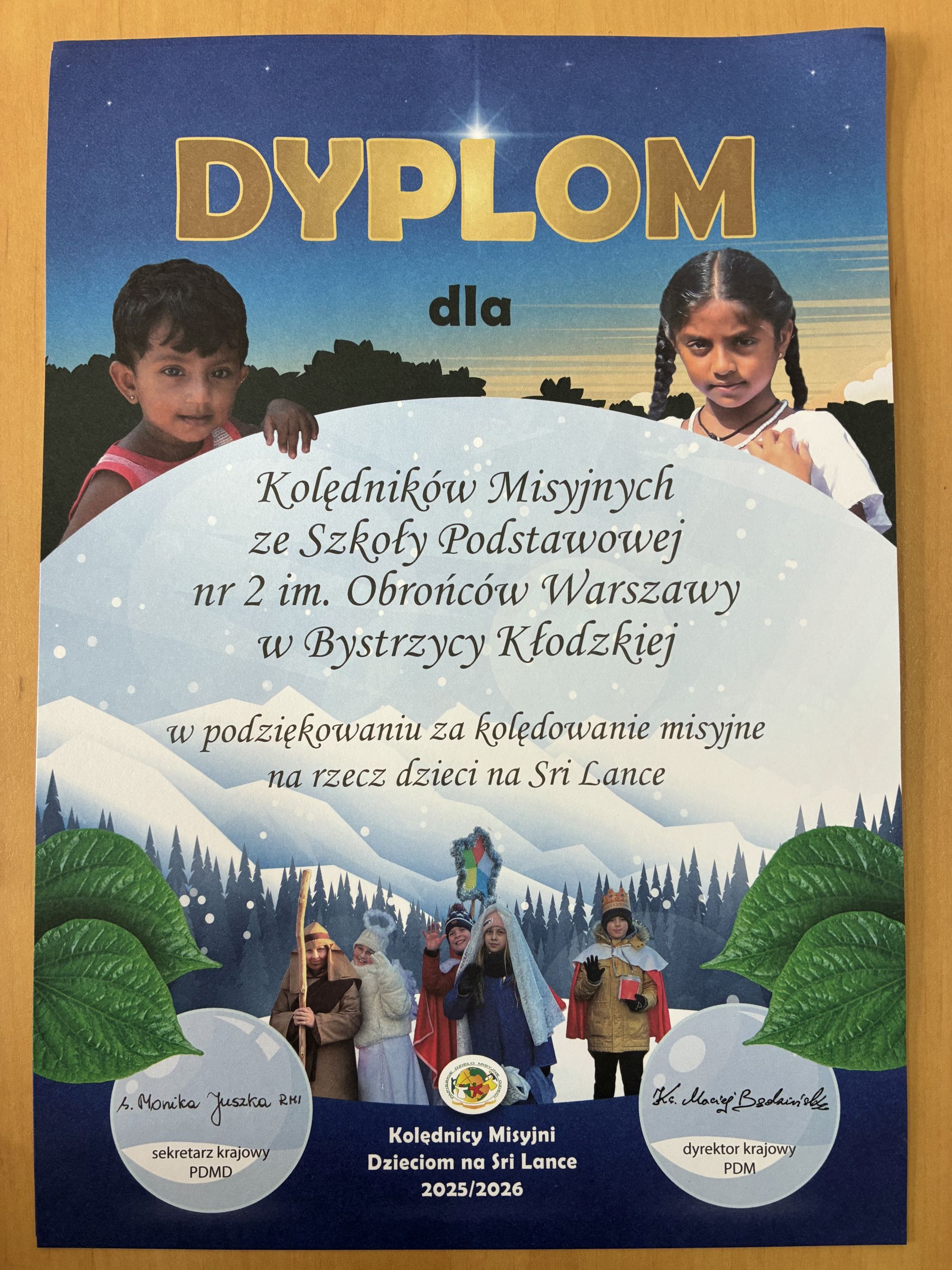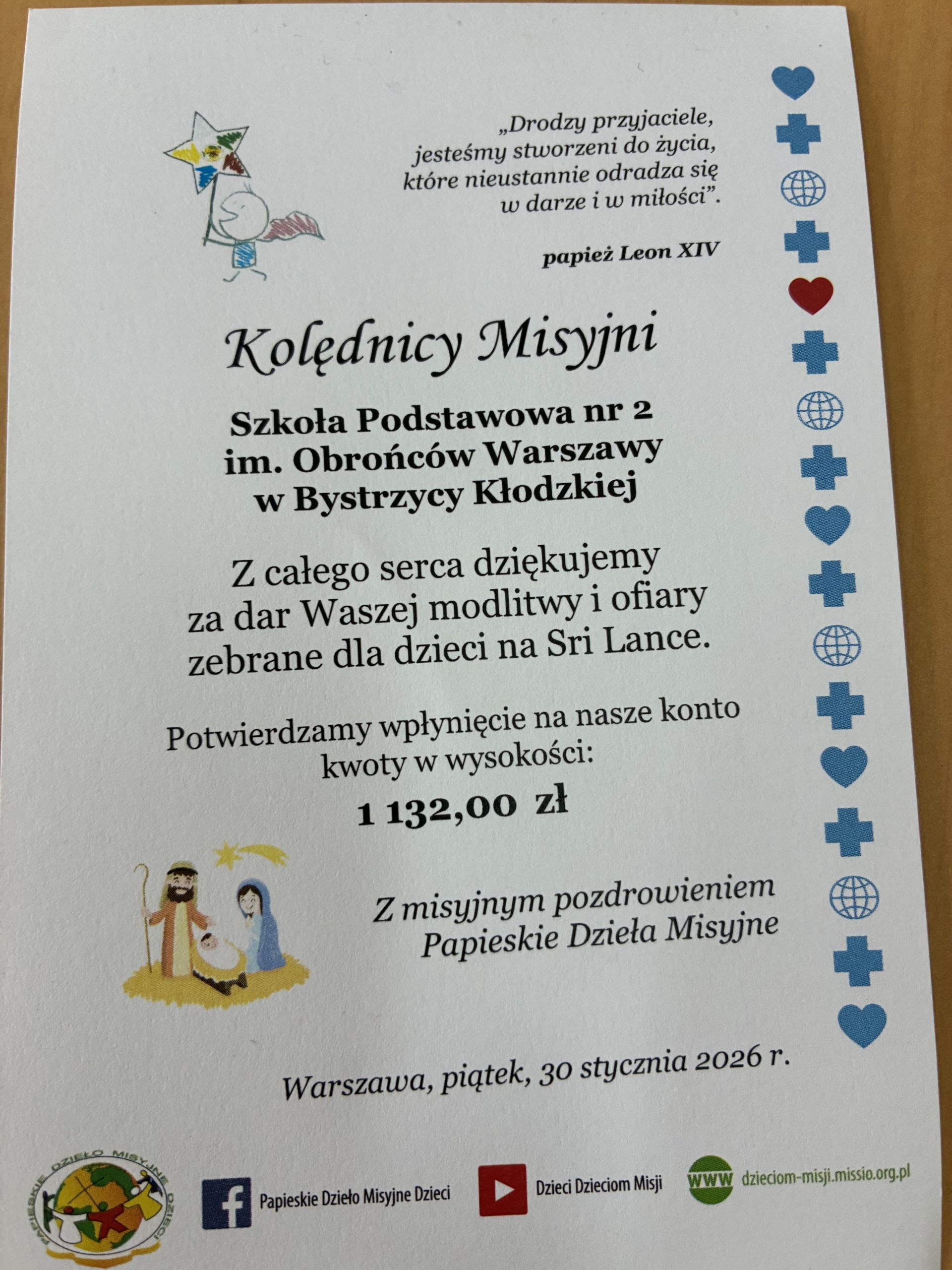 Dzięki zaangażowaniu naszych uczniów oraz życzliwości osób, które wsparły zbiórkę, udało się przekazać na pomoc dzieciom na Sri Lance kwotę 1 132,00 zł. Otrzymaliśmy dyplom oraz list z podziękowaniem za modlitwę, kolędowanie i zebrane ofiary.